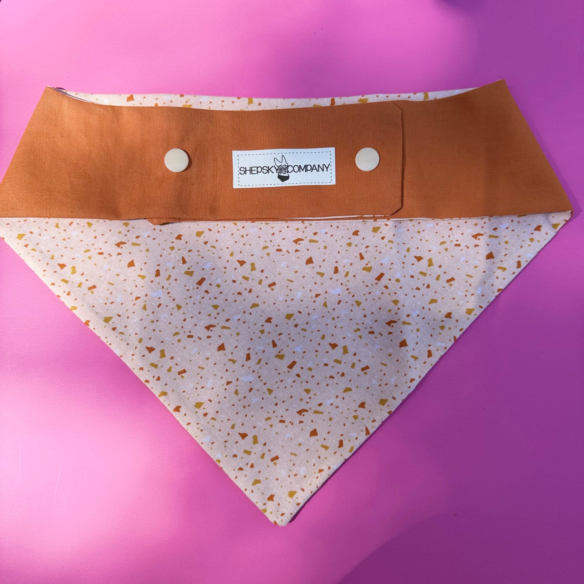 Get ready for fall vibes with our Autumn Confetti bandana! Featuring beautifully toned autumn leaf brown solid side and a confetti side of all your fall favorite colors, this reversible pattern lets you switch up your style in a flash. Perfect for adding a playful pop of autumn charm to your pet's look.