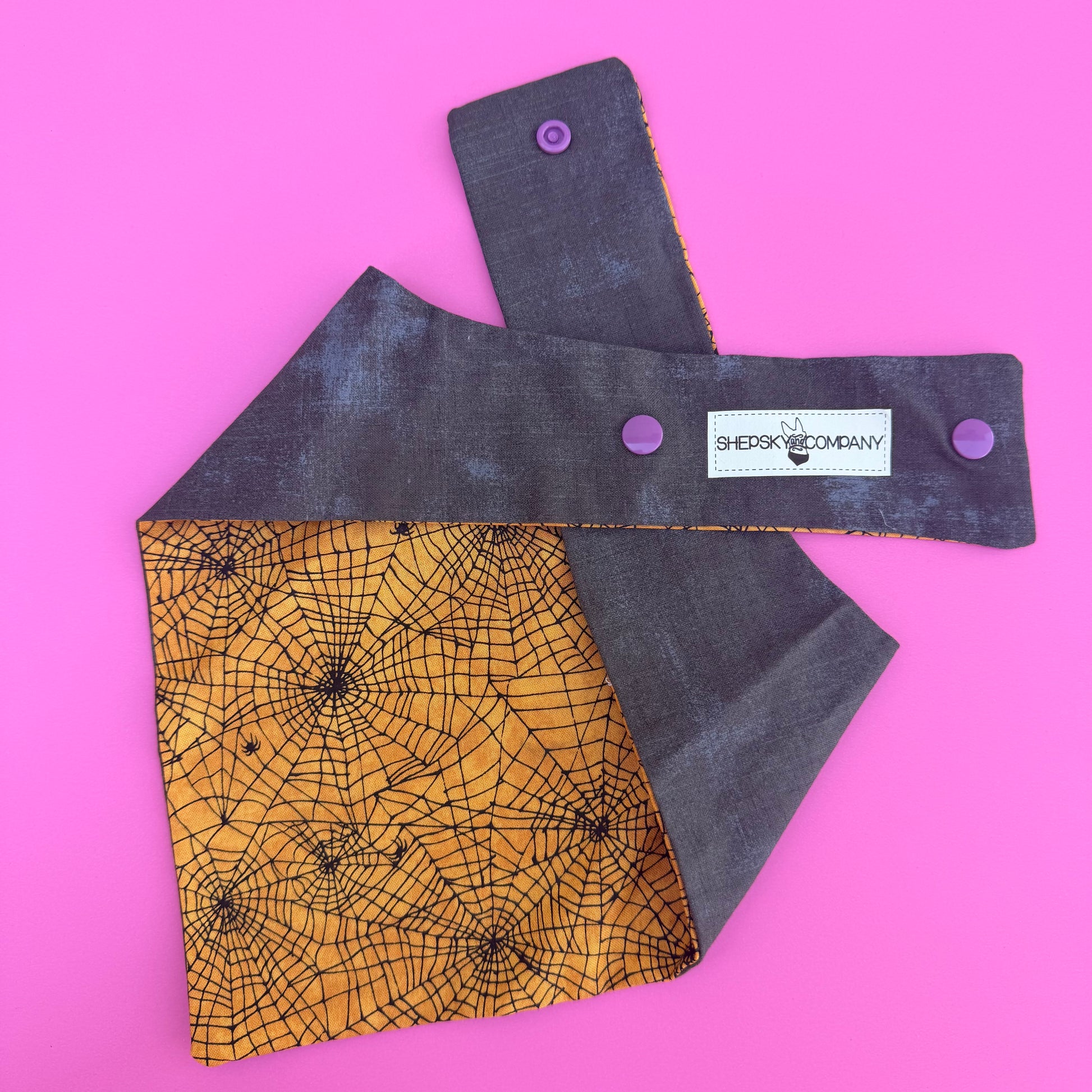 Get ready for spooky halloween vibes with our orange Spiderweb bandana! Featuring orange fabric black spiderwebs side , this reversible pattern lets you switch up your style in a flash. Perfect for adding a playful pop of halloween charm to your pet's look.